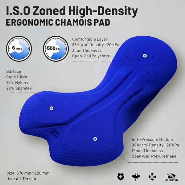 The I.S.O chamois is zoned with 12 mm padding at the sit-bone zone for support and 10 mm at the perineal zone to help reduce pressure. It’s positioned for long-duration, high-intensity riding and is rated up to 6 hours / 500 km (comfort may vary by saddle, fit, and riding posture).